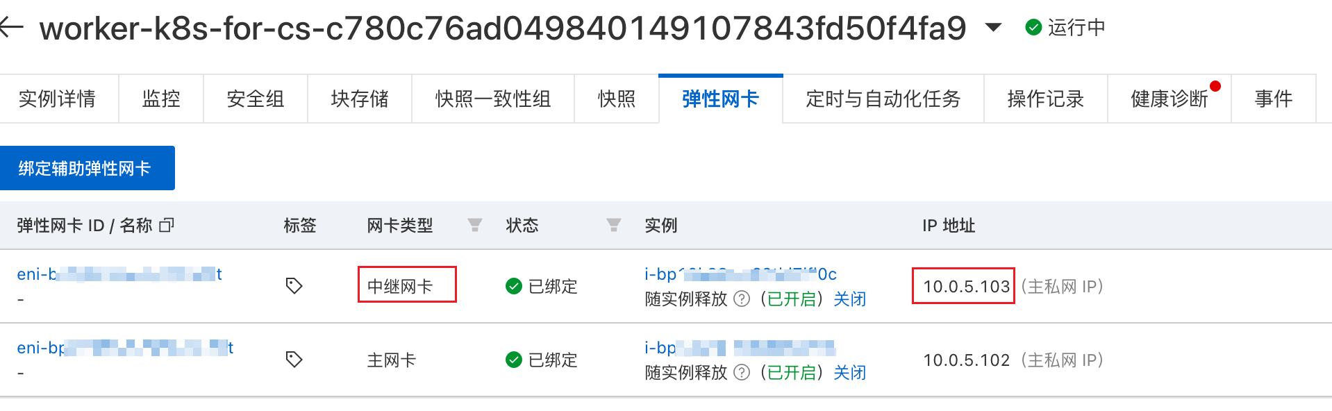 从阿里云控制台可以看到,该 Pod IP 通过中继网卡插到了节点上(ENI Trunking):