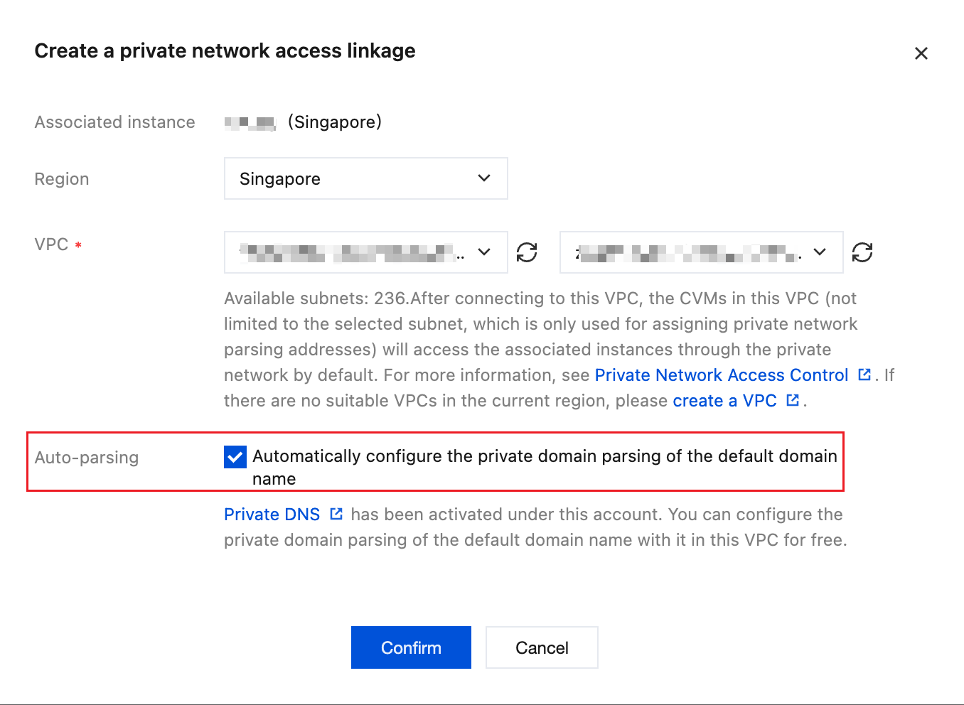 Additionally, TKE cluster nodes pulling Cilium dependency images also need to be able to access the TCR image repository. Refer to Configuring Private Network Access Control to enable private network access between the image repository and the VPC where the TKE cluster is located, ensure that the VPC where the Cilium upload client is located establishes a private network access link with the TCR image repository, and make sure to check Auto Resolution: